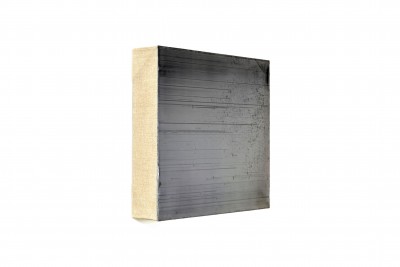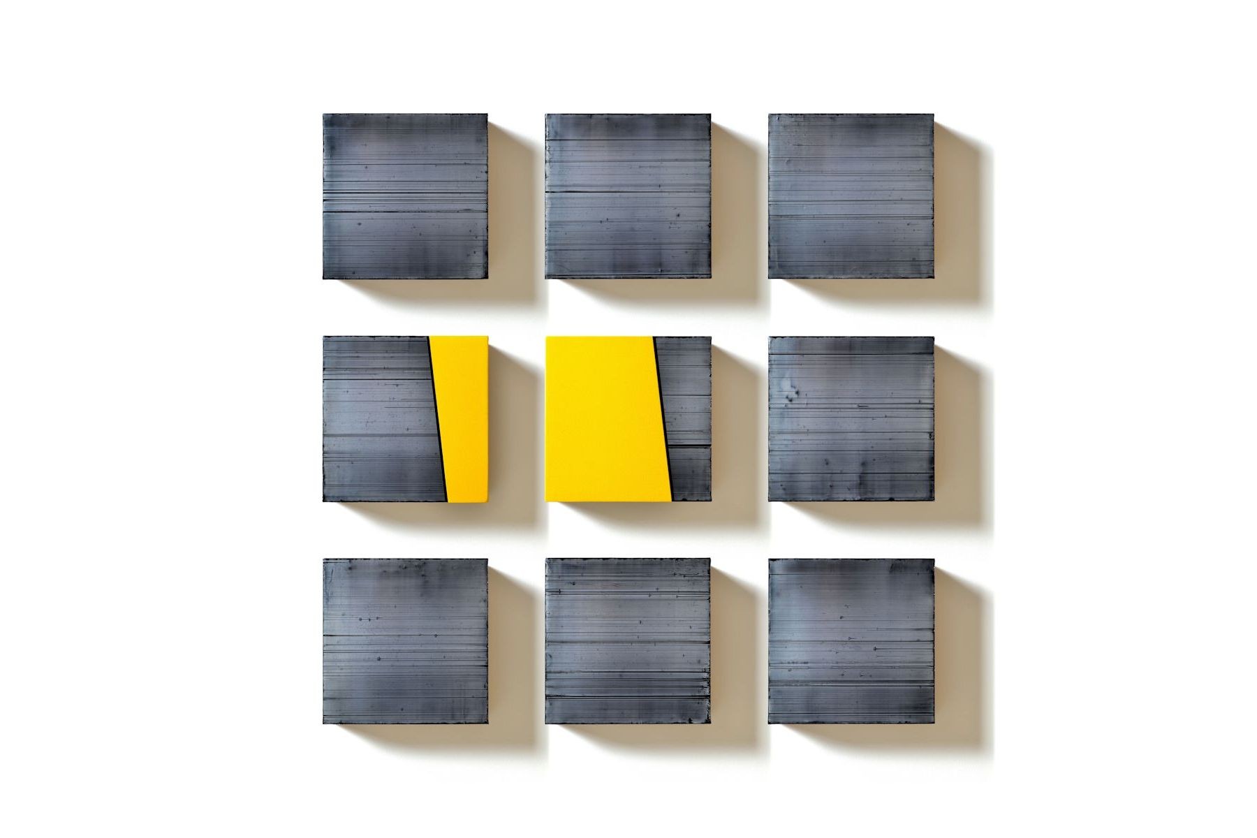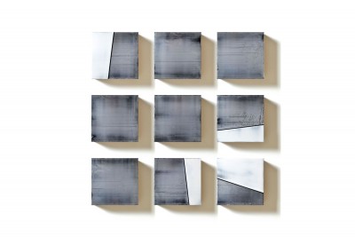 Nine By Nine Grey. Acrylic and polyester on linen. Each panel 23cm x 23cm. Overall dimensions 99cm x 99cm. 2018.