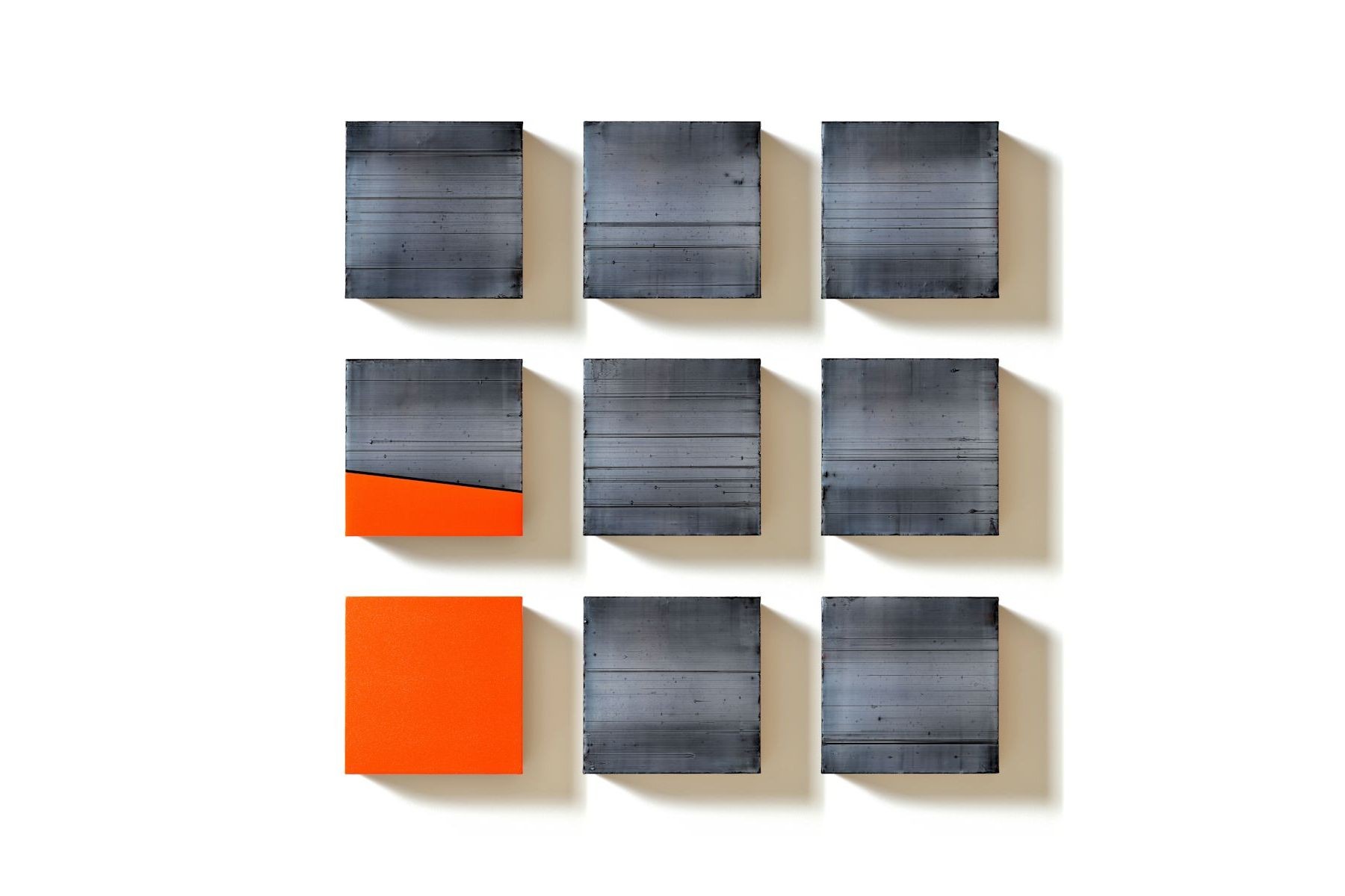 Nine By Nine Orange. Acrylic on linen. Each panel 23cm x 23cm. Overall dimensions 99cm x 99cm. 2018.