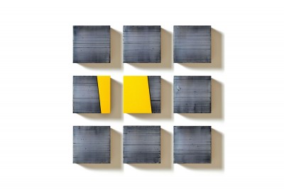 Nine By Nine Yellow. Acrylic on linen. Each panel 23cm x 23cm. Overall dimensions 99cm x 99cm. 2018.